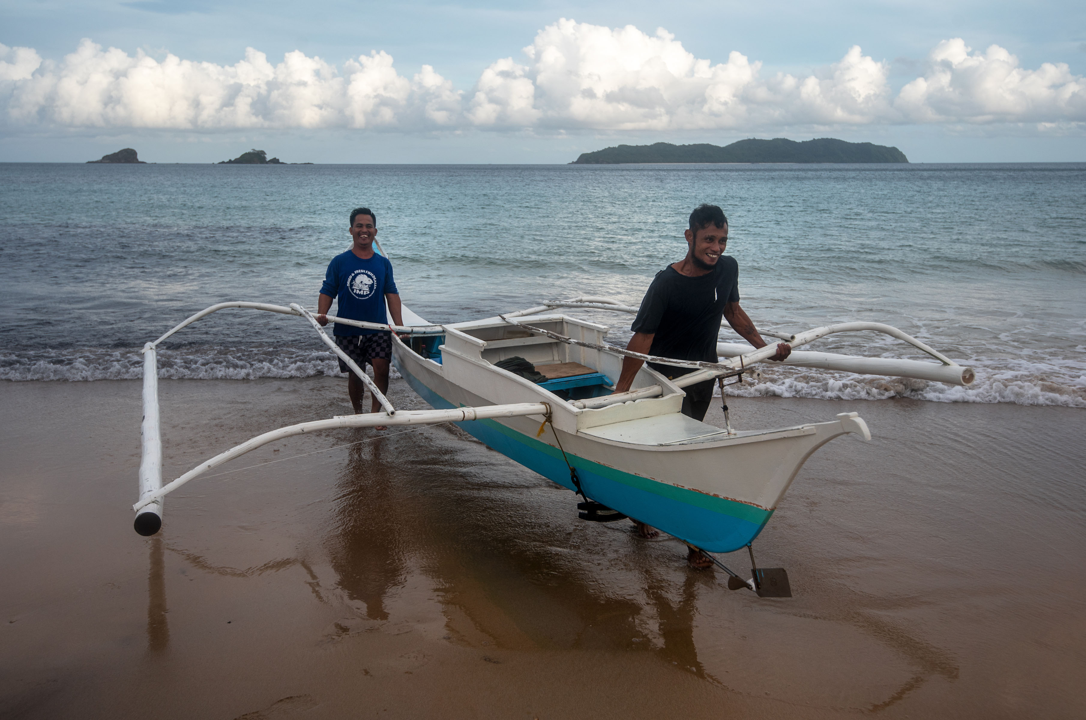 Nacpan Beach, Palawan: Carrying the boat that is heavy with a small diesel engine